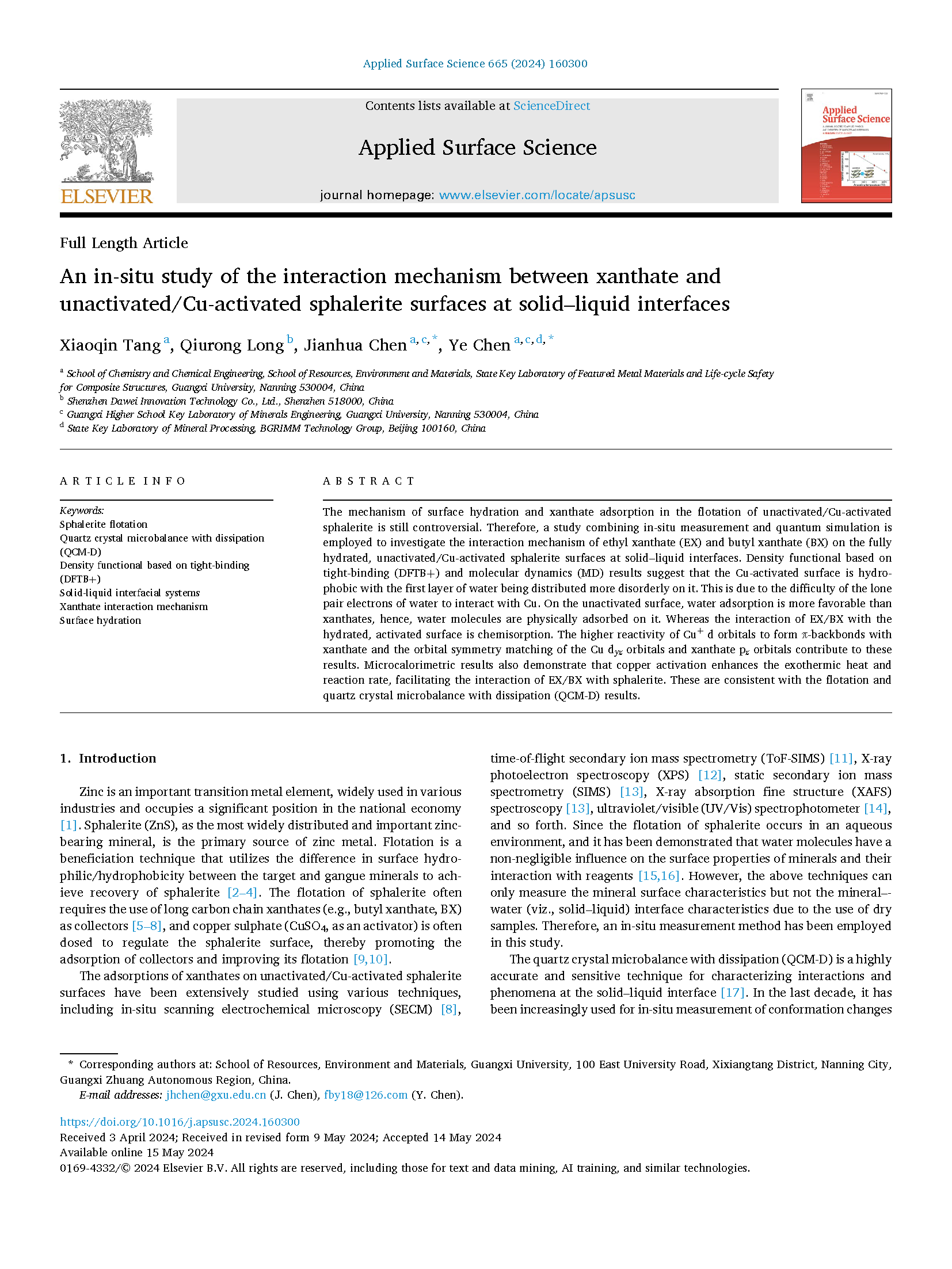 近期,深圳市大為創新科技股份有限公司(以下簡稱“大為股份”、“公司”)郴州鋰電新能源產業項目(以下簡稱“大為股份郴州鋰電項目”)采選基地研發團隊負責人龍秋容博士與廣西大學在讀博士研究生唐瀟琴等人攜手合作,在國際知名SCI一區期刊《應用與表面科學》上成功發表了題為《未活化/銅活化閃鋅礦表面與捕收劑黃藥固液相互作用機理的原位研究》的論文。該研究深入剖析了閃鋅礦在不同活化狀態下的表面性質以及其與黃藥(一種常用硫化礦物捕收劑)之間的固液相互作用機制。