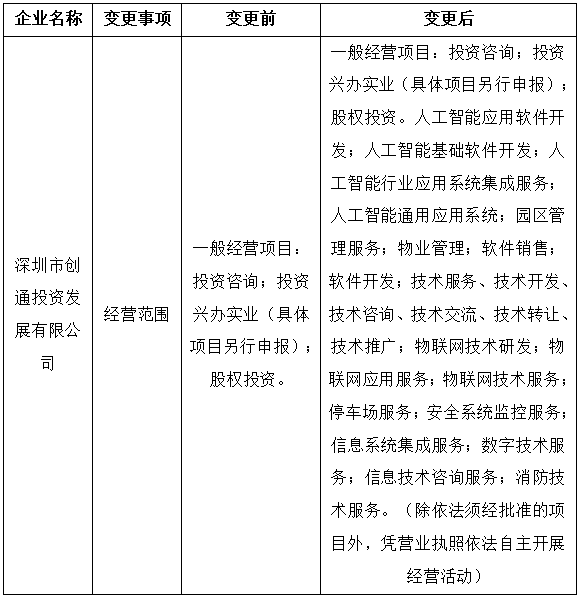 創通投資本次變更經營范圍后,將新增開展樓宇智能化管理軟件的銷售及技術服務,根據客戶的使用場景,提供軟件使用權以及教學培訓;智慧園區管理軟件系統的銷售及技術服務,應用場景:出入口門禁、安全巡邏、人員大數據管理等。