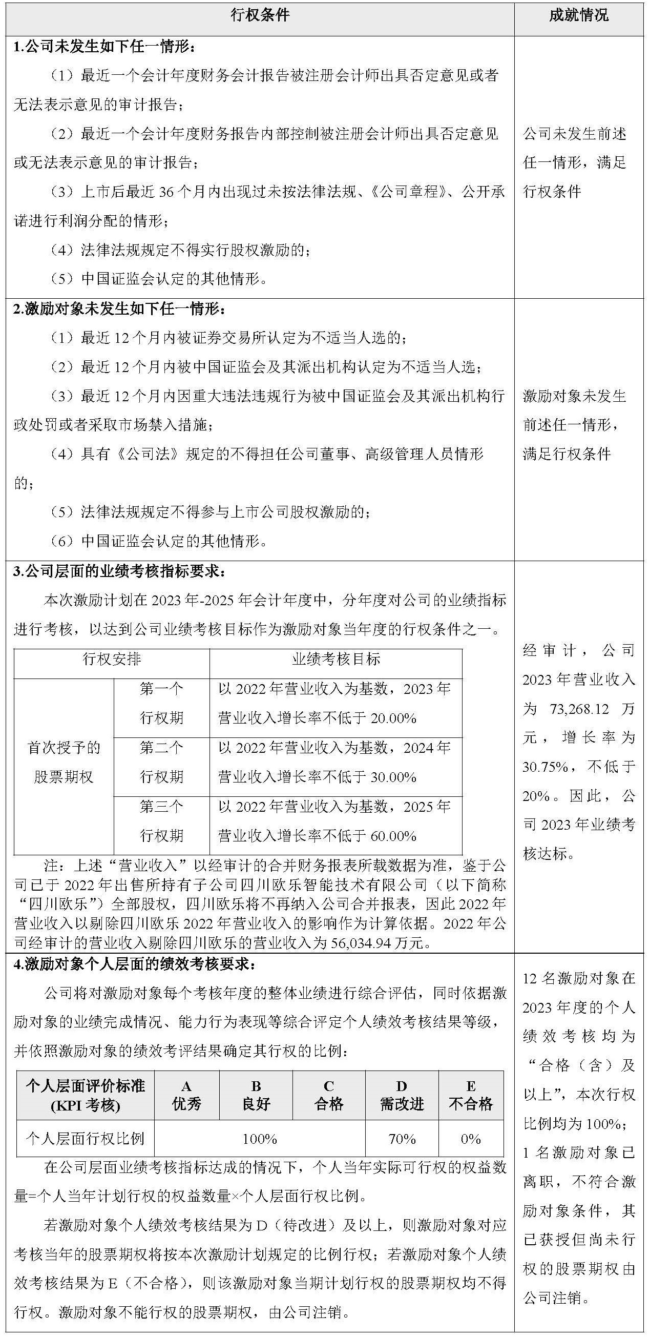 2.2023年股票期權與限制性股票激勵計劃(以下簡稱“本次激勵計劃”)首次授予股票期權第一個行權期符合行權條件的激勵對象共12名,可行權的股票期權數量共計16.6380萬份,行權價格為12.43元/份。