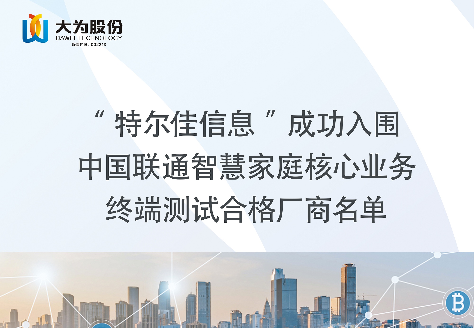 近日,中國聯通印發《中國聯通智慧家庭核心業務終端測試合格廠商名單(2022年7月評審通過)》的通知。深圳市大為創新科技股份有限公司(簡稱“公司”或“大為股份”)旗下全資子公司深圳市特爾佳信息技術有限公司(簡稱“特爾佳信息”)憑借可靠的產品質量、優質的服務和良好的企業信譽,經過嚴格評審,成功入圍中國聯通智慧家庭核心業務終端測試合格廠商名單,將進一步推動公司運營商業務的發展。